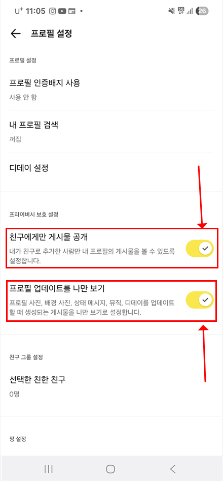 이 설정을 하면 프로필을 수정해도 친구 피드에 표시되지 않습니다.