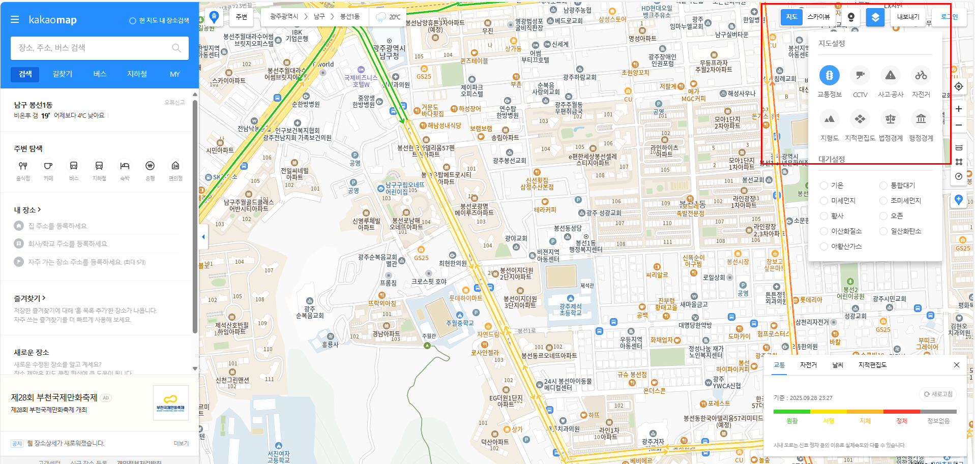 - “교통” 선택 시 도로 상황이 색상으로 표시됨