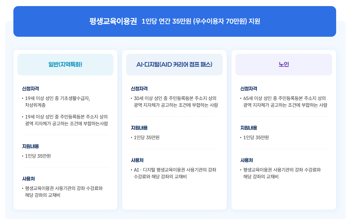 - 사용처: 국가평생교육진흥원에 등록된 평생교육기관 (학원, 대학 부설 평생교육원 등)